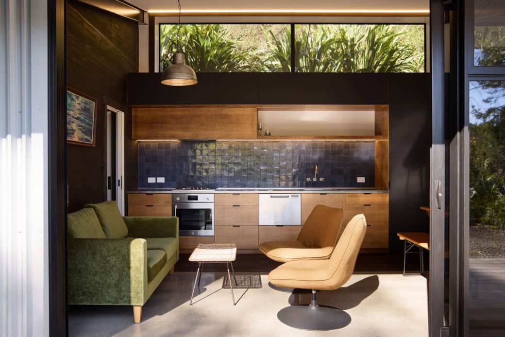 Open plan kitchen, dining and lounge area, opening up onto a large, sunny but sheltered deck.